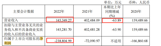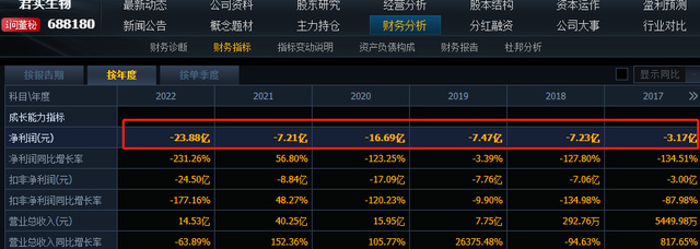 业绩数据来看,2022 年,君实生物实现营业收入14.53亿元,同比下降63.89%,净利润亏损23.88亿。