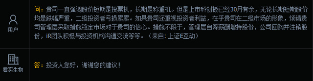 对于君实生物如此股价表现,有股民着急了,在互动平台上提问:上市科创板已经30月有余,无论长期短期股价均是跌幅严重,二级投资者亏损累累。如果贵司还重视投资者利益,在乎贵司在二级市场的形象,烦请贵司管理层采取措施稳定市场对于贵司的信心。