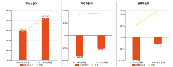公司营业总收入为18.06亿元。归母净利润为-5.96亿元,在已披露的同业公司中排名第29。经营活动现金净流入为-3.43亿元,在已披露的同业公司中排名第29。