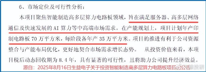 这个新项目聚焦智能制造高多层算力电路板领域,规划年产能70万㎡。其中,第一阶段35万㎡预计2026年试生产,第二阶段35万㎡预计2027年试生产。