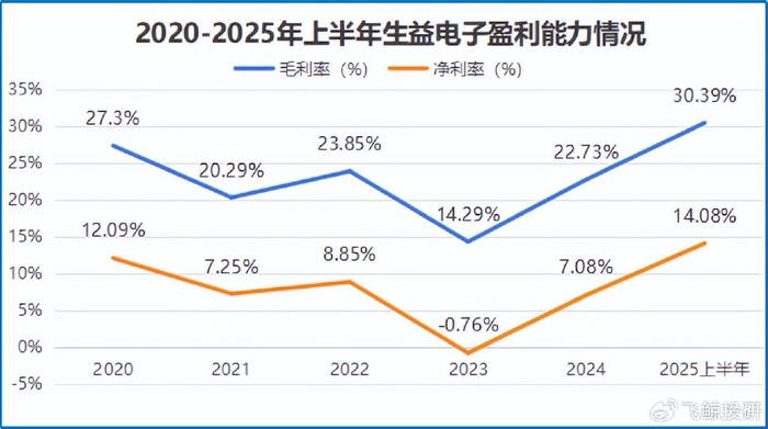 也是因为高端产品的放量,2025年上半年,生益电子的毛利率攀升至30.39%,较2024年提升近8个百分点,还超过了鹏鼎控股(19.07%)等同行,盈利能力进一步凸显。