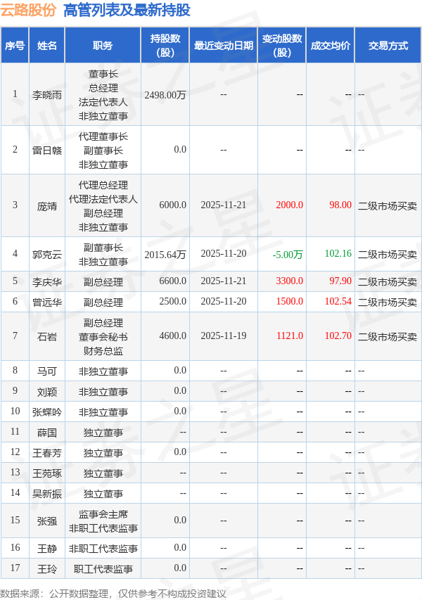 云路股份的高管列表及最新持股情况如下: