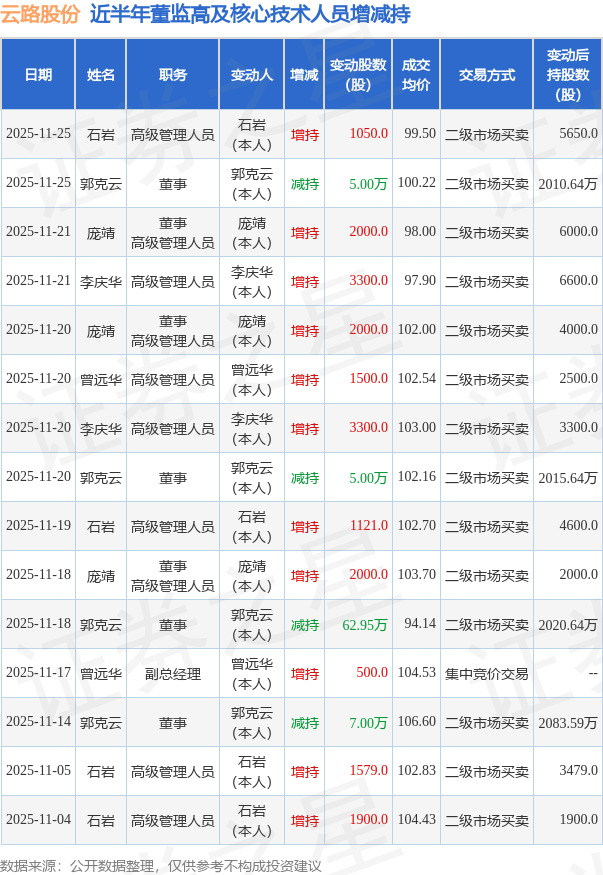 云路股份近半年内的董监高及核心技术人员增减持详情如下: