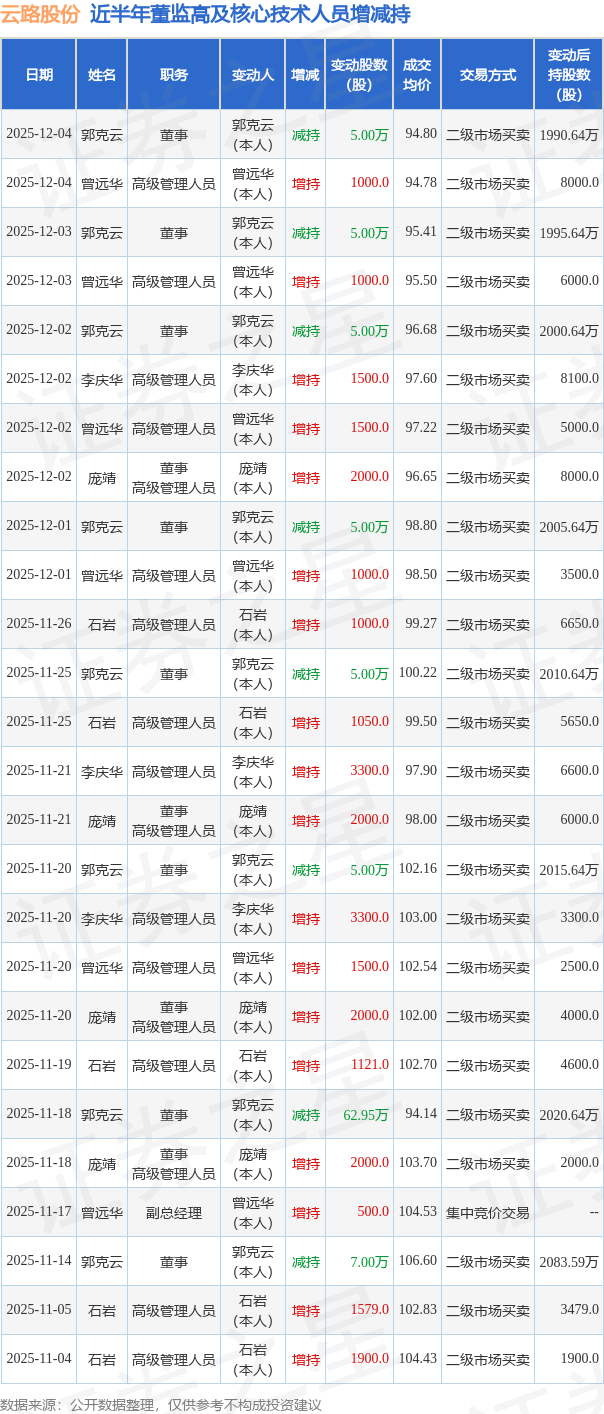 云路股份近半年内的董监高及核心技术人员增减持详情如下: