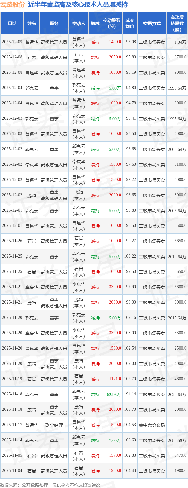 云路股份近半年内的董监高及核心技术人员增减持详情如下: