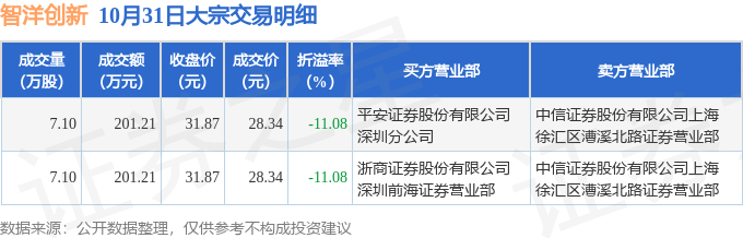 10月31日智洋创新现2笔折价11.08%的大宗交易 合计成交402.42万元