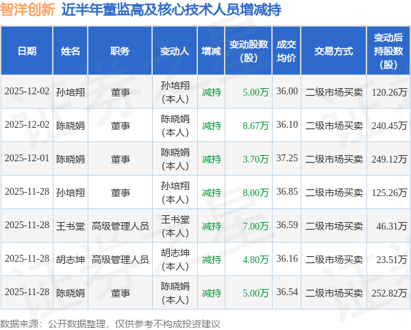 智洋创新:12月2日高管陈晓娟、孙培翔减持股份合计13.67万股