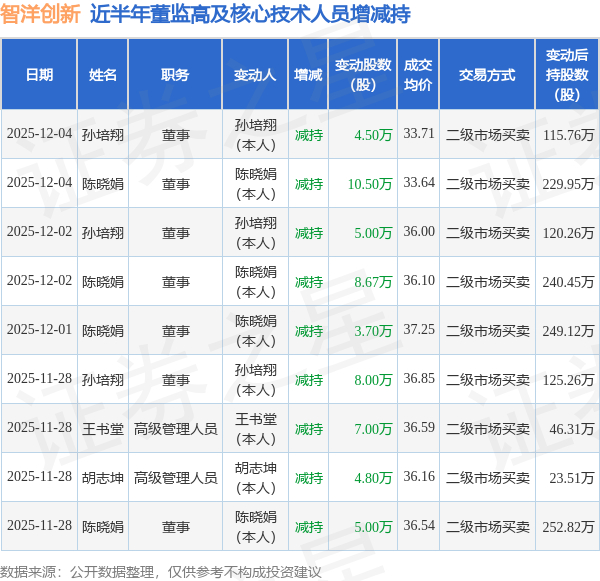 智洋创新近半年内的董监高及核心技术人员增减持详情如下: