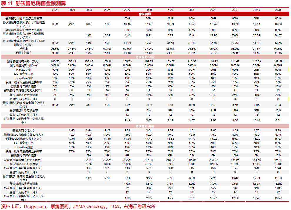 定价方面参考奥希替尼并给予第四代EGFR TKI一定溢价,认为上市后年费用为21万元/年,后续随着竞品上市阶梯式降价。