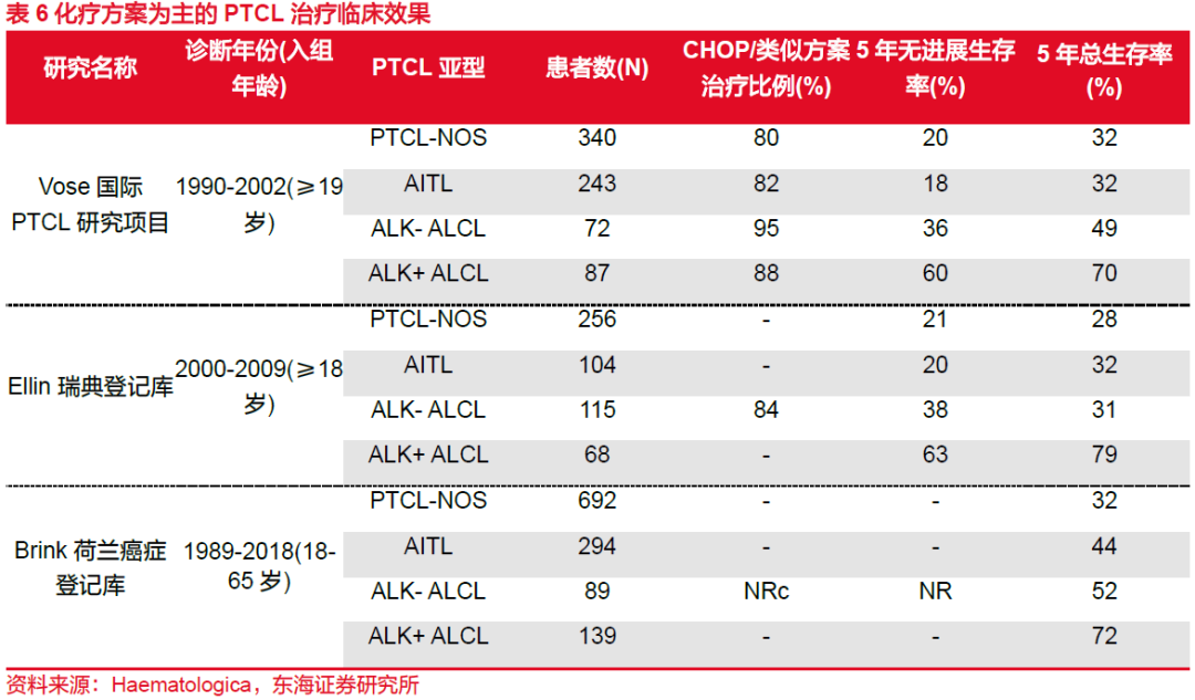 PTCL长期生存指标鲜有改善,超过一半患者将进展至r/r PTCL。外周T细胞淋巴瘤(PTCL)是起源于成熟T细胞或NK细胞的高度异质性侵袭性淋巴瘤,属于非霍奇金淋巴瘤(NHL)的一种,占NHL整体的15%–25%。PTCL—线治疗常采用以CHOP或CHOP样方案(如CHOEP)为基础的化疗方案,治疗总体缓解率(ORR)为 70%~80%,尽管新药及其联合治疗已经显著提升了反映近期疗效的ORR和CR,但在长期生存指标如5年-10年的PFS和OS上,尚未观察到显著的改善。根据一项2023年发表在Haematologica上的研究,在上述方案的治疗背景下,除了间变大细胞淋巴瘤激酶阳性(ALK+)的间变大细胞淋巴瘤(ALCL)5年生存率可超过70%以外,其它类型5年OS率均不超过45%,且50%~70%的患者将复发或进展到复发/难治型外周T细胞淋巴瘤(r/r PTCL)。
