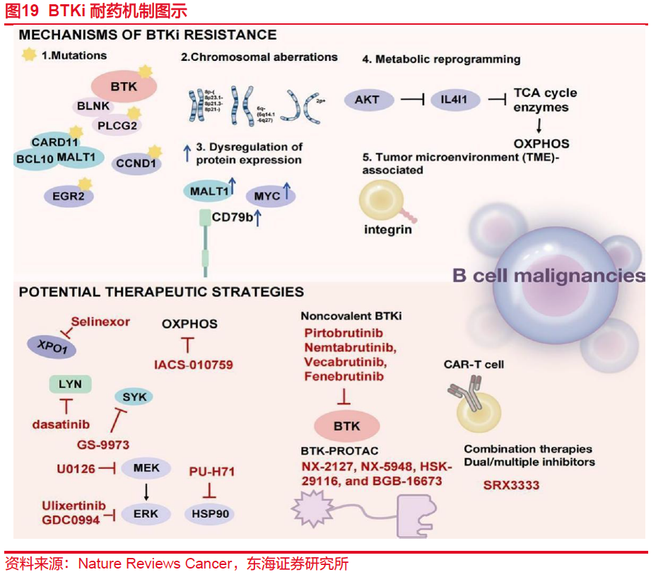 然而C481S, L528W等BTK激酶结构域的突变会导致不可逆共价结合型BTK抑制剂因无法结合相应位点而失效,同时旁路激活和PI3K、NFκB等信号通路的代偿性激活亦导致耐药的发生。目前针对耐药问题,主流的研发方向包括非共价BTK抑制剂、多靶点抑制剂以及BTK降解剂(如BTK Protac)。多靶点抑制剂可在抑制BTK活性的同时抑制其他可能的代偿性激活通路,从而克服旁路激活耐药,是极具潜力的研究方向。