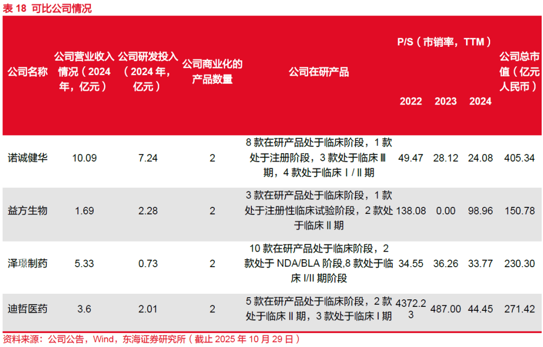 我们选取了业务模式类似的A股创新公司作为可比公司,包括诺诚健华-U、益方生物、泽璟制药。截至2025年10月28日,可比公司2024年的P/S平均值为52.27,迪哲医药2024年的P/S为44.45,略低于可比公司平均值。