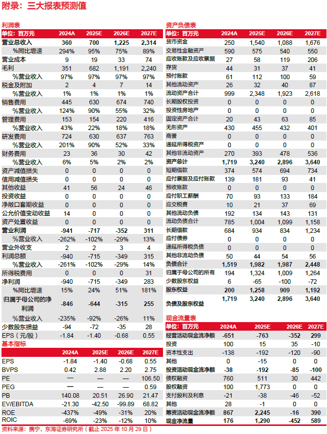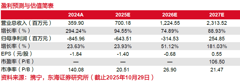 我们对公司的毛利率和三费费用率假设如下,预计公司将于2025-2027年实现营业收入7.00/12.25/23.14亿元(同比+94.55%/+74.89%/88.93%),归母净利润-6.44/-3.15/2.55亿元(同比+23.93%/+51.12%/181.03%)。