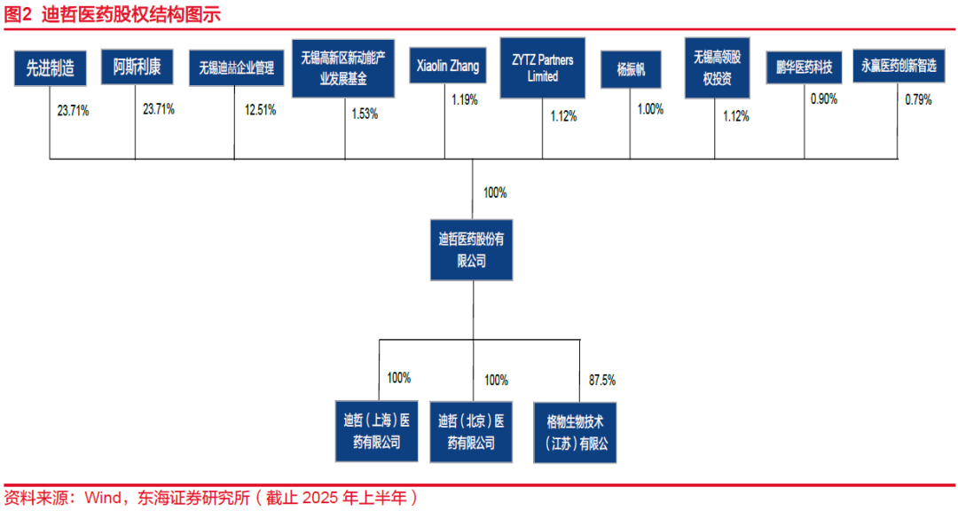 先进制造和阿斯利康为公司前两大股东,公司无控股股东和实际控制人。截止2025年年上半年,先进制造产业投资基金和阿斯利康并列公司前两大股东,各自均持股23.71%。公司创始人张小林及其一致行动人ZYTZ、无锡迪喆合计持有公司14.82%股份。副总经理,首席医学官杨振帆持有公司1.00%股份。