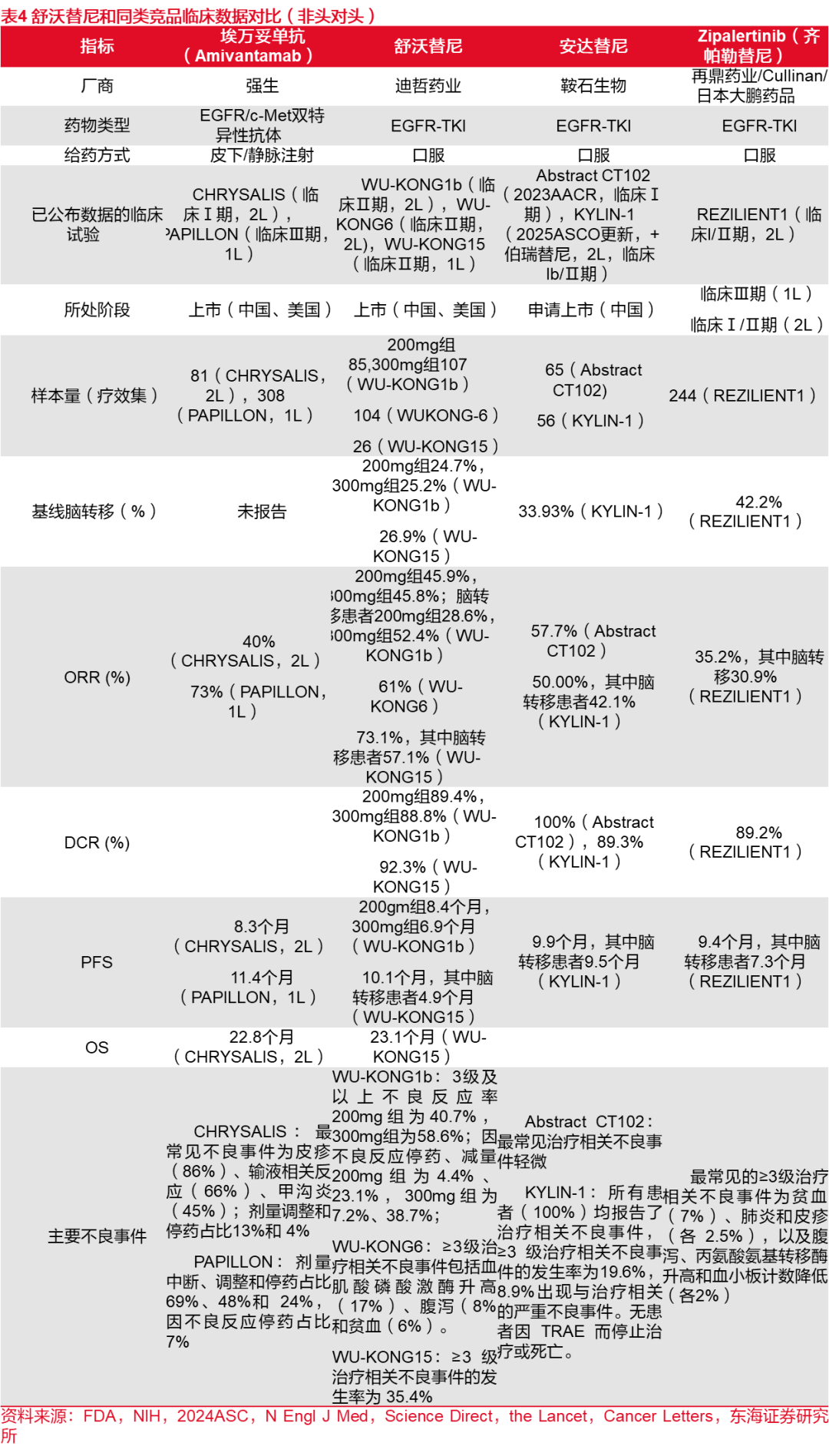 舒沃替尼已在中美两地上市,或改变EGFR Exon20ins突变NSCLC治疗格局:公司核心产品舒沃哲是首个且唯一在中美均获得突破性疗法认定的国产创新药,也是全球首个且唯一经FDA获批上市的 EGFR exon20ins NSCLC国产创新药,具有绝对的领先意义。EGFR Exon20ins突变是中国NSCLC患者中发生率位居第三的突变,在临床中具有重要意义。传统的第三代EGFR-TKI对EGFR ex20ins患者基本失效,疗效甚至差于EGFR野生型患者。舒沃哲已于2023年8月在中国获批上市,并已纳入医保。2025年7月用于二线及以上治疗EGFR Exon20ins NSCLC的适应症获美国FDA批准上市。目前,舒沃哲1L治疗该适应症的全球III期注册临床研究(WU-KONG28)已在2025年H1完成患者入组,非头对头研究比较显示,舒沃哲1L治疗EGFR Exon20ins NSCLC的ORR、mPFS和OS数据均较埃万妥单抗有更好的表现,安全性方面也未发现新的警戒信号,有望重塑Exon20ins突变NSCLC的1L治疗格局。