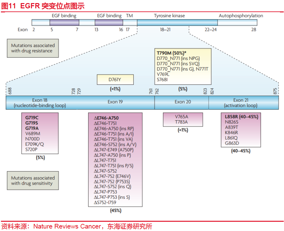 EGFR exon20in是第三常见突变,在临床中具有重要意义。根据文献报道,NSCLC中EGFR突变率在亚洲、欧洲、美国分别为38%、14%、24%。常见的EGFR 突变包括 19 号外显子缺失(19del,约占EGFR突变的45%)和21号外显子点突变(L858R,约占EGFR 突变的40%),以上这些突变共同构成了 EGFR突变的80%至90%。外显子插入(ex20ins)突变是NSCLC中第三常见的突变,仅次于19del 和 L858R,约占所有EGFR突变的5%-10%。EGFR Exon20ins(exon20插入突变)于EGFR蛋白的α-C螺旋(E762–M766)和磷酸结合环(P-loop, A767–V774)区域,导致药物结合口袋缩小,形成空间位阻,阻碍传统EGFR-TKI与靶点结合,导致一至三代EGFR-TKI对患者失效。