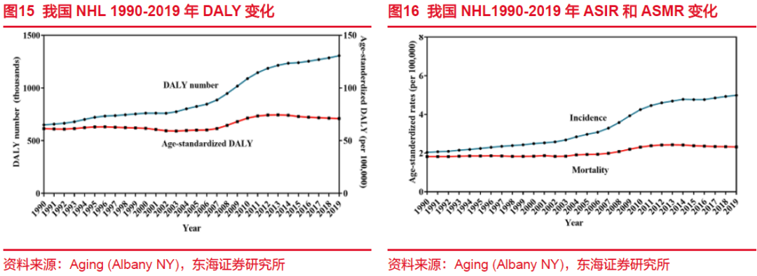 我国NHL流行病学负担极高,且呈现不断加重趋势。B细胞非霍奇金淋巴瘤 (B-NHL)是一种具有高度异质性且病情发展迅速、恶性程度较高的血液系统恶性肿瘤。我国具有较严重的NHL流行病学负担,且呈加重趋势。GBD 2019数据显示,我国NHL新发病例和致死病例分别占全球的20.1%和17.4%。根据中国疾控中心王黎君等在《Aging (Albany NY).》上发表的研究结果,在1990年-2019年间我国NHL的DALY(伤残调整寿命年)数量和年龄标化DALY分别增加了100.9%和15.6%,每10万人的ASIR(年龄标化发病率)和ASMR(年龄标化死亡率)分别增加了14.2%和21.9%。