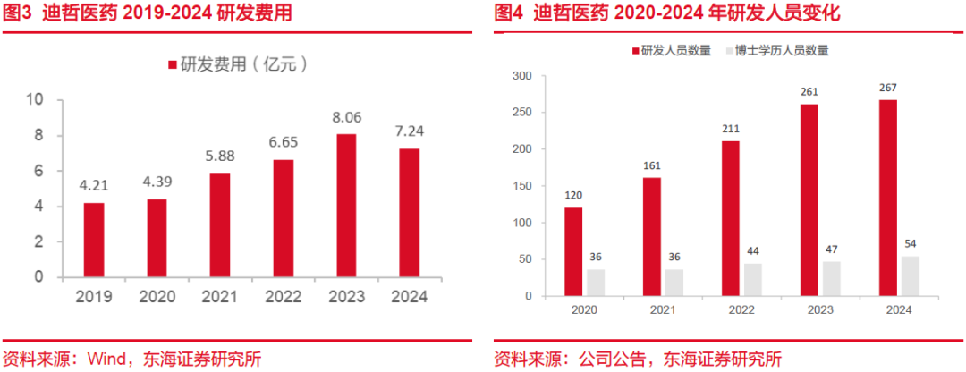 迪哲医药以研发创新为立身之本,始终保持高研发投入,2019-2024年研发费用从4.21亿元增长至7.24亿元。公司研发人员从2020年的120人增长到2024年的267人,其中博士学历研发人员从2020年的36人增长到2024年的54人,占研发人员比重保持在20%左右,与作为新锐biotech的企业性质吻合。