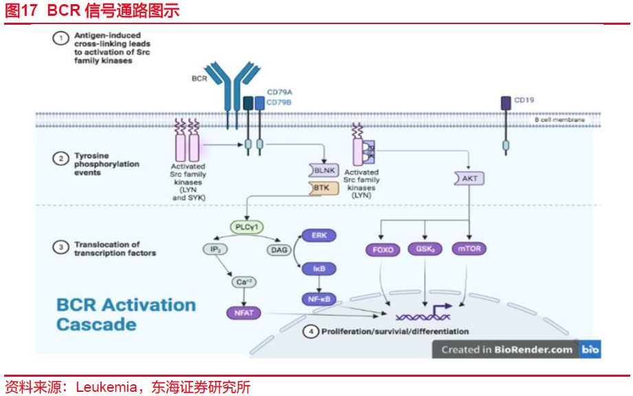 布鲁顿酪氨酸激酶 (Bruton’s tyrosine kinase, BTK)在B细胞受体 (B-cell receptor, BCR)信号通路中扮演了关键角色,BTK磷酸化后激活下游通路,从而促进B细胞增殖、存活及迁移。在B细胞淋巴瘤中,BCR通路异常持续激活,导致BTK依赖性肿瘤细胞存活和增殖。小分子BTK抑制剂可通过结合BTK的活性位点,阻断BCR信号通路的传导,从而抑制B细胞淋巴瘤细胞的存活和增殖。