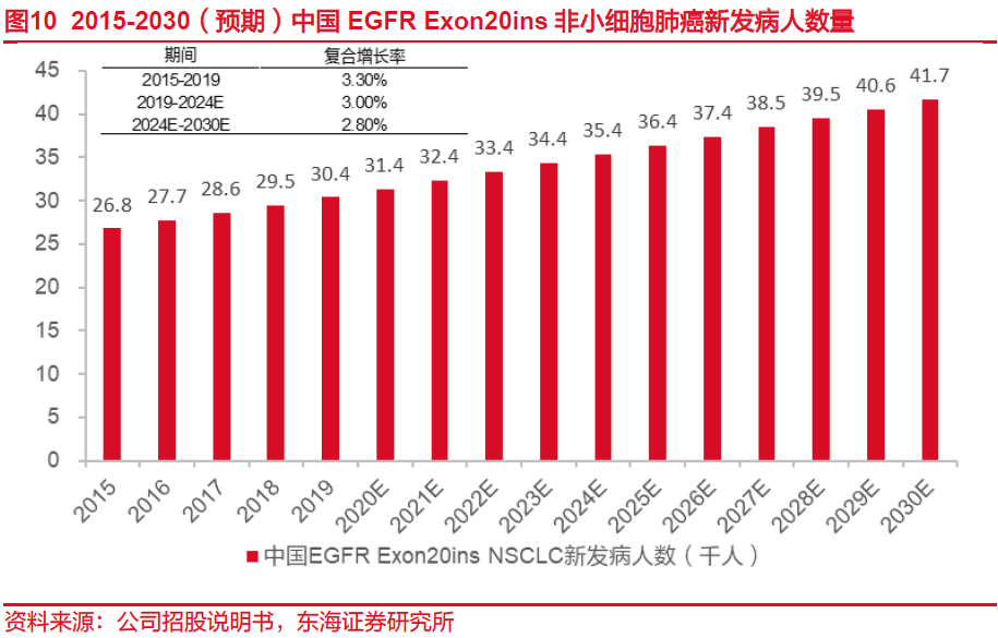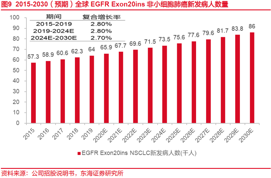 EGFR Exon20ins突变是中国NSCLC患者中发生率位居第三的突变。根据Frost&Sullivian的预测,2024-2030年全球EGFR exon20ins的发病人数将以2.7%的年复合增长率增长至8.60万人,我国将以2.7%的年复合增长率同步增长至4.17万人;因此,针对EGFR Exon20ins突变开发相应药物在非小细胞肺癌(NSCLC)中具有重要临床意义和市场价值。