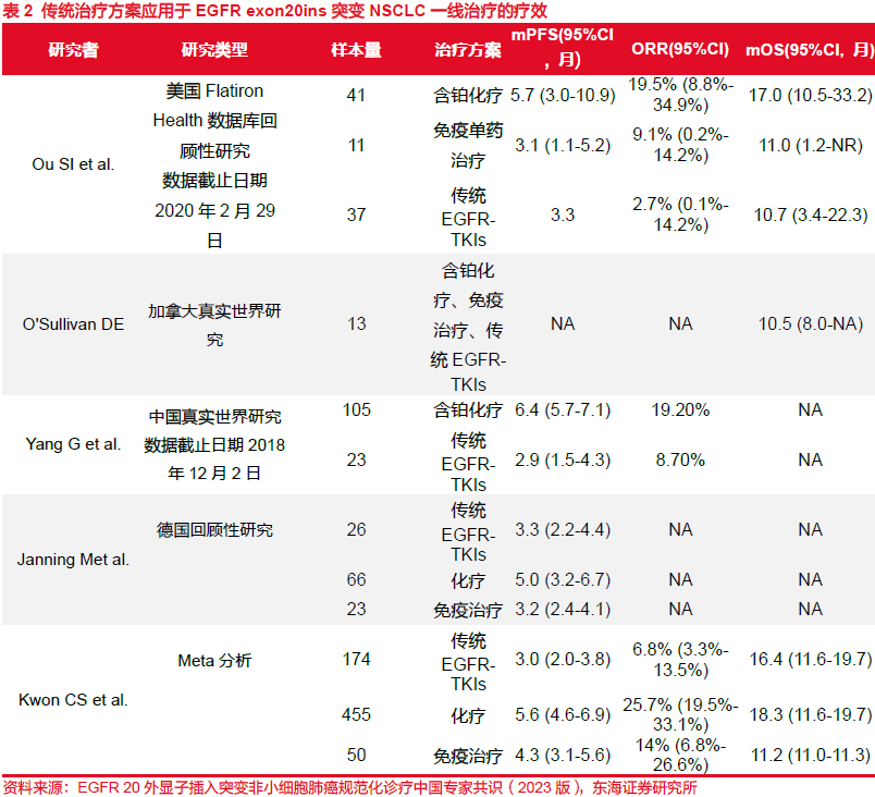EGFR ex20ins患者对传统EGFR-TKI几乎原发耐药,疗效甚至差于EGFR野生型患者。根据《EGFR 20外显子插入突变非小细胞肺癌规范化诊疗中国专家共识(2023版)》,与常见EGFR突变NSCLC患者相比,EGFR ex20ins突变NSCLC患者的真实世界无进展生存期(rwPFS)和真实世界总生存期(real world overall survival, rwOS)均大幅缩短(2.9个月vs 10.5个月,16.2个月vs 25.5个月)。EGFR ex20ins突变NSCLC患者的预后较EGFR常见突变患者更差。阿美替尼、奥希替尼等已上市的第三代EGFR TKI以针对Ex19del/L858R突变/T790M突变为主,因此传统EGFR-TKI用于 EGFR ex20ins 突变 NSCLC 患者预后相对较差,一项纳入23项真实世界研究的系统综述及 Meta 分析显示,对于EGFR ex20ins突变NSCLC患者,传统 EGFR-TKIs、化疗及免疫治疗作为一线治疗时, ORR分别为6.8%、25.7%和14.0%,PFS分别为3.0个月(n = 174)、5.6个月(n = 455)和4.3个月(n = 50),均不超过6个月。