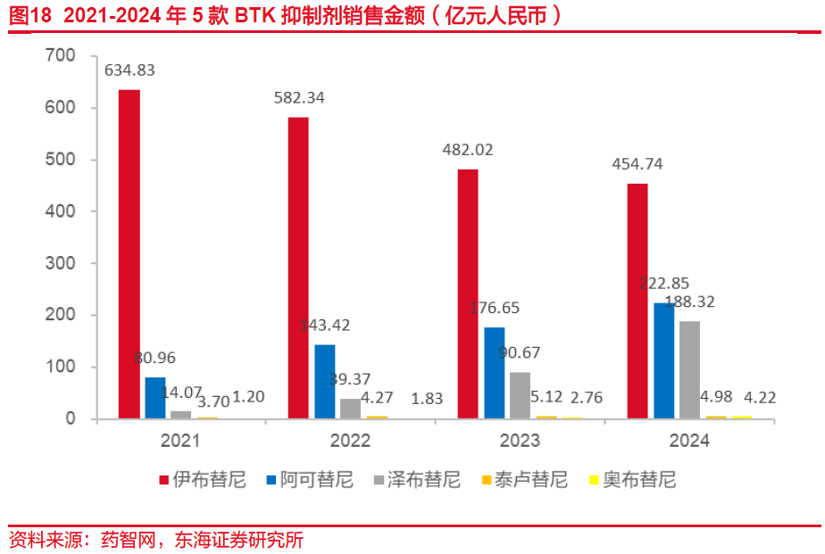 BTK抑制剂整体已达800亿元规模,新一代BTK抑制剂市场份额快速增长。目前全球共有6款BTK抑制剂上市,分别包括第一代抑制剂强生/艾伯维的伊布替尼(Ibrutinib),第二代抑制剂阿斯利康的阿卡替尼(Acalabrutinib)、百济神州的泽布替尼(Zanubrutinib)、诺诚健华的奥布替尼(Orelabrutinib)以及第三代抑制剂礼来的Pirtobrutinib(吡妥布替尼)和小野制药的Tirabrutinib(替拉鲁替尼)。近年来全球BTK抑制剂市场稳健增长,2024年5款BTK抑制剂药物合计销售额为875.11亿元人民币,同比增长15.57%。伊布替尼曾作为商业化表现最佳的BTK抑制剂,于2021年以97.77亿美元位列全球最畅销药物第七位,但随着百济神州的泽布替尼展现出Best in class潜力,伊布替尼的市场份额从2021年的86.40%下降至2024年的51.96%,泽布替尼的市场份额则从2021年的1.92%增长至2024年的21.52%(换算至人民币计算)。