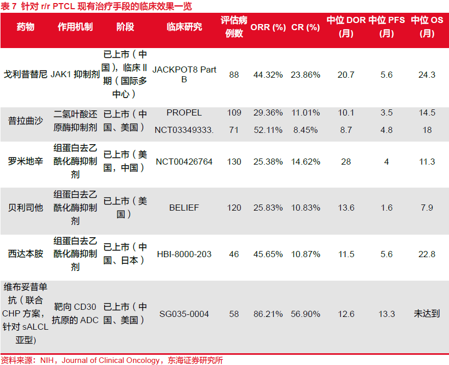 r/r PTCL患者预后差,缺乏有效治疗方案。r/r PTCL指经一线治疗(如CHOP方案)后疾病进展或无效的患者,预后极差,对于一线化疗后的复发难治型患者(r/r PTCL),目前尚无标准的巩固治疗方案,常规化疗挽救性治疗对于r/r PTCL的疗效较差,中位生存时间仅约6.5月,即使进行自体造血干细胞移植,其2年无进展生存率也仅为21%。根据一项针对633名r/r PTCL患者的研究,难治性患者和复发性患者的中位生存期(SAR)分别为5个月和11个月,3年总生存率仅为 21%和 28%,难治性患者中62%在接受挽救性治疗后未能达到至少部分缓解的疗效,因此不符合接受移植的条件。FDA 针对r/r PTCL批准了众多针对r/r PTCL的二线治疗单药方案,虽然部分方案的ORR有较好表现,但DOR/OS/PFS等长期生存指标均不理想。