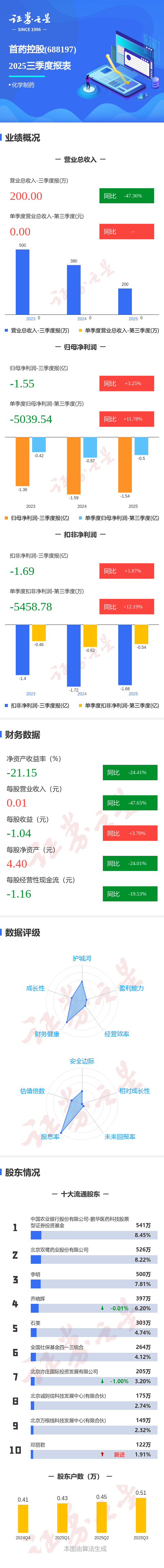 证券之星消息,首药控股2025年三季报显示,前三季度公司主营收入200.0万元,同比下降47.37%;归母净利润-1.55亿元,同比上升3.26%;扣非净利润-1.69亿元,同比上升1.87%;其中2025年第三季度,公司单季度主营收入0.0万元,单季度归母净利润-5039.54万元,同比上升11.78%;单季度扣非净利润-5458.78万元,同比上升12.19%;负债率14.12%,投资收益675.63万元,财务费用-49.59万元。