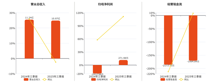 公司营业总收入为10.97亿元,较去年同报告期营业总收入减少2688.70万元,同比较去年同期下降2.39%。归母净利润为271.98万元。经营活动现金净流入为-1994.84万元。