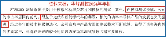 2024年,公司自己就表示:“在模拟测试领域,公司的市占率居国内前列”。受益于光伏和新能源汽车爆发,相关功率半导体产品也突飞猛进地发展。