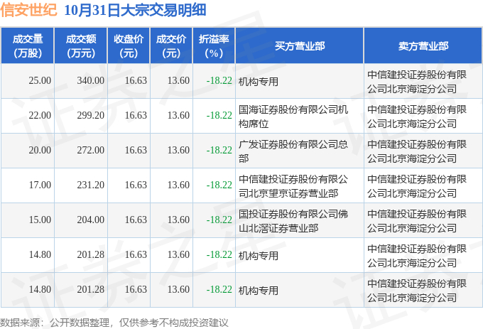 10月31日信安世纪现7笔折价18.22%的大宗交易 合计成交1748.96万元