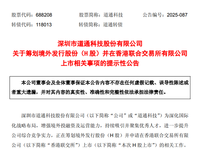 瑞财经 李兰 10月24日,道通科技(688208.SH)发布公告,公司正在筹划境外发行股份(H股)并申请在香港联交所上市的相关工作。