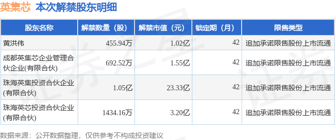 证券之星消息,根据市场公开信息整理,英集芯(688209)于10月20日将有1.3亿股限售股份解禁,为公司追加承诺限售股份上市流通,占公司总股本30.36%。(本次数据根据历史公告整理得出,实际情况以上市公司最新公告为准)本次解禁后,公司已无限售股份。具体如下图所示: