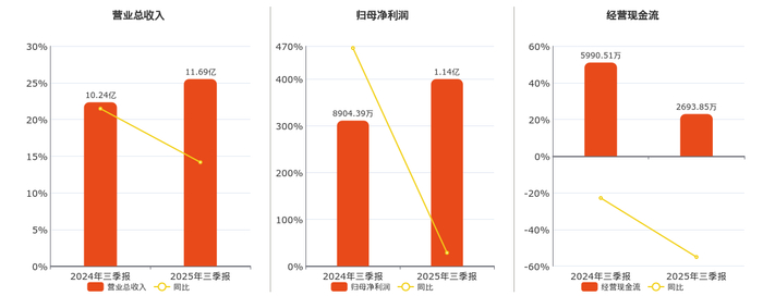公司营业总收入为11.69亿元。归母净利润为1.14亿元。经营活动现金净流入为2693.85万元,较去年同报告期经营活动现金净流入减少3296.66万元,同比较去年同期下降55.03%。