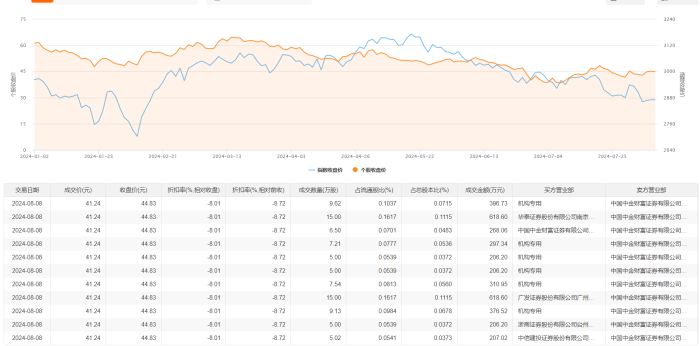 8月8日大宗交易成交90.02万股,成交额3712.42万元,占当日总成交额的52.88%,成交价41.24元,较市场收盘价44.83元折价8.01%。