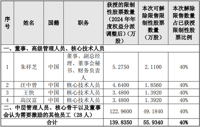 根据公告内容,本次股票上市流通的数量为56万股,上市流通日期定于2025年10月23日。此次解除限售的条件已满足,涉及32名激励对象,解除限售的股票数量占公司总股本的0.56%。具体如下: