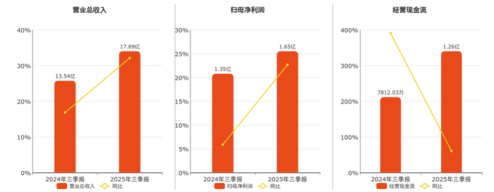 公司营业总收入为17.89亿元。归母净利润为1.65亿元。经营活动现金净流入为1.26亿元。