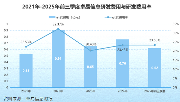 所以卓易信息的研发投入一直都不低,2025年前三季度公司研发费用为0.62亿元,研发费用率达到23.5%。