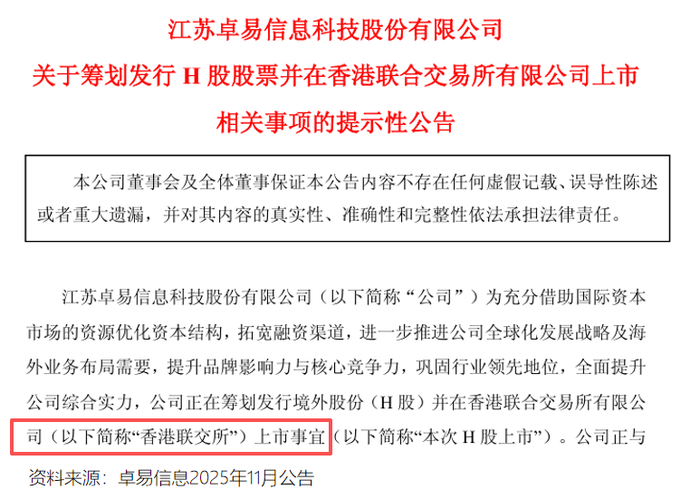 2025年11月21日,卓易信息发布公告,称为了推进全球化发展战略及海外业务布局需要,公司正在筹划港股上市事宜。