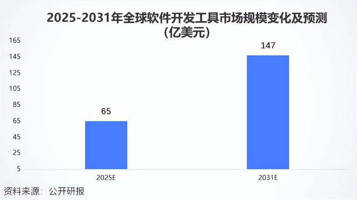 AI编程支持、低代码技术应用普及,IDE行业发展势头迅猛。预计2025年全球软件开发工具市场规模为65亿美元,2031年将增加至147亿美元,年复合增长率高达14.5%。