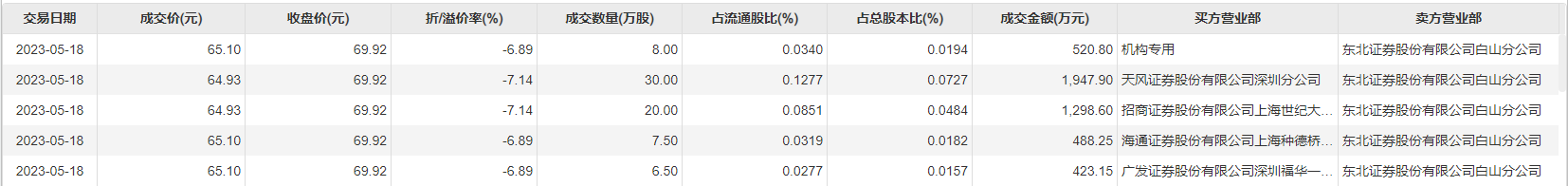百克生物5月18日大宗交易成交72万股,成交额4678.7万元,占当日总成交额的33.01%,成交均价64.98元,较市场收盘价69.92元折价7.07%,其中最高成交价65.1元,最低成交价64.93元。