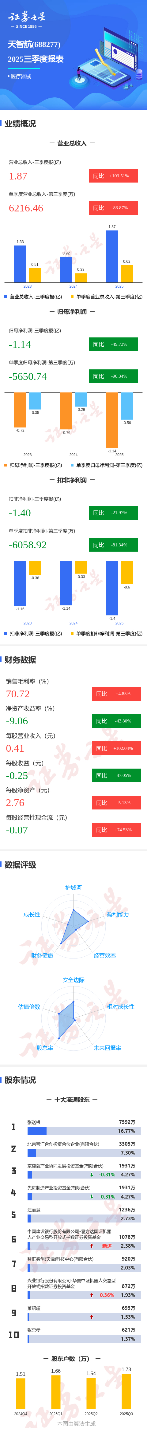 图解天智航三季报:第三季度单季净利润同比下降90.34%