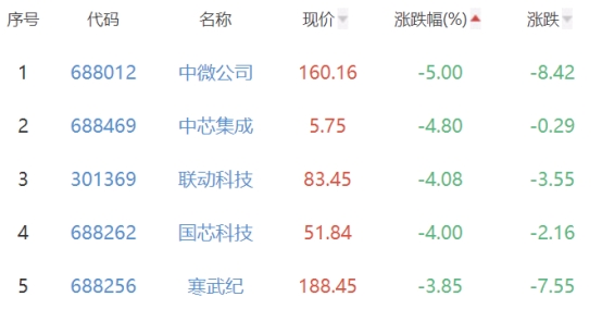 中微公司、中芯集成、联动科技、国芯科技、寒武纪位列涨幅榜后五位,涨幅分别为-5.00%、-4.80%、-4.08%、-4.00%、-3.85%。