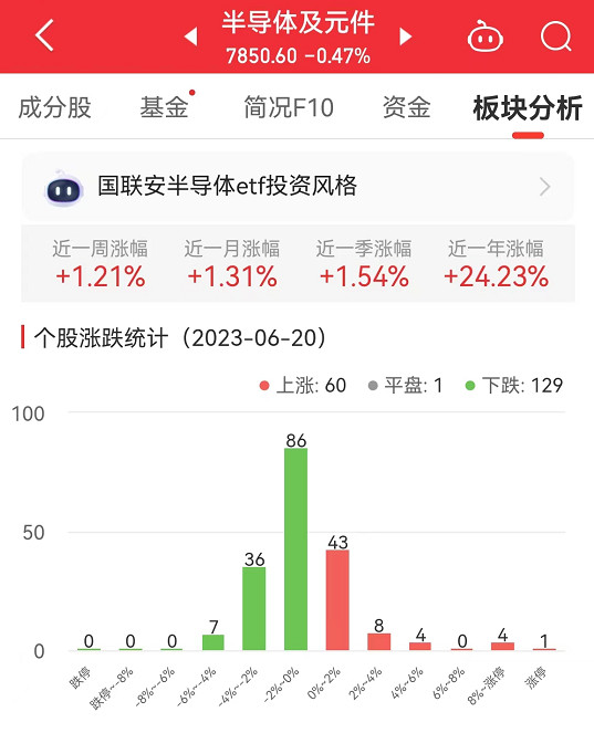 中国经济网北京6月20日讯 今日,半导体及元件板块整体跌幅0.47%,其中,60只股票上涨,1只股票平盘,129只股票下跌。