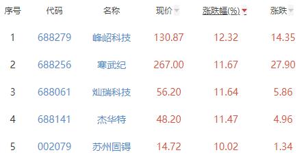 其中,峰岹科技、寒武纪、灿瑞科技、杰华特、苏州固锝位列板块涨幅前五位,涨幅分别为12.32%、11.67%、11.64%、11.47%、10.02%。