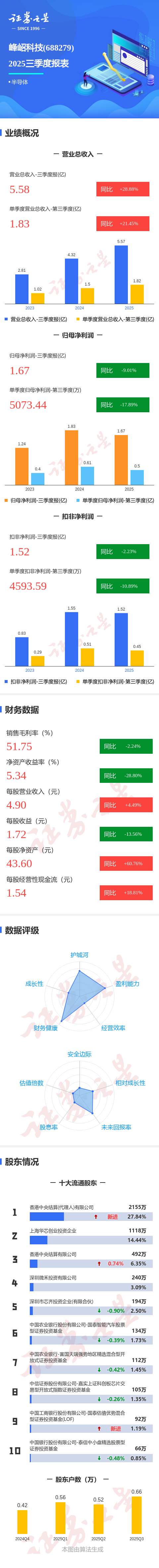 图解峰岹科技三季报:第三季度单季净利润同比下降17.89%