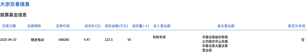 精进电动今日大宗交易折价成交50万股,成交额223.5万元