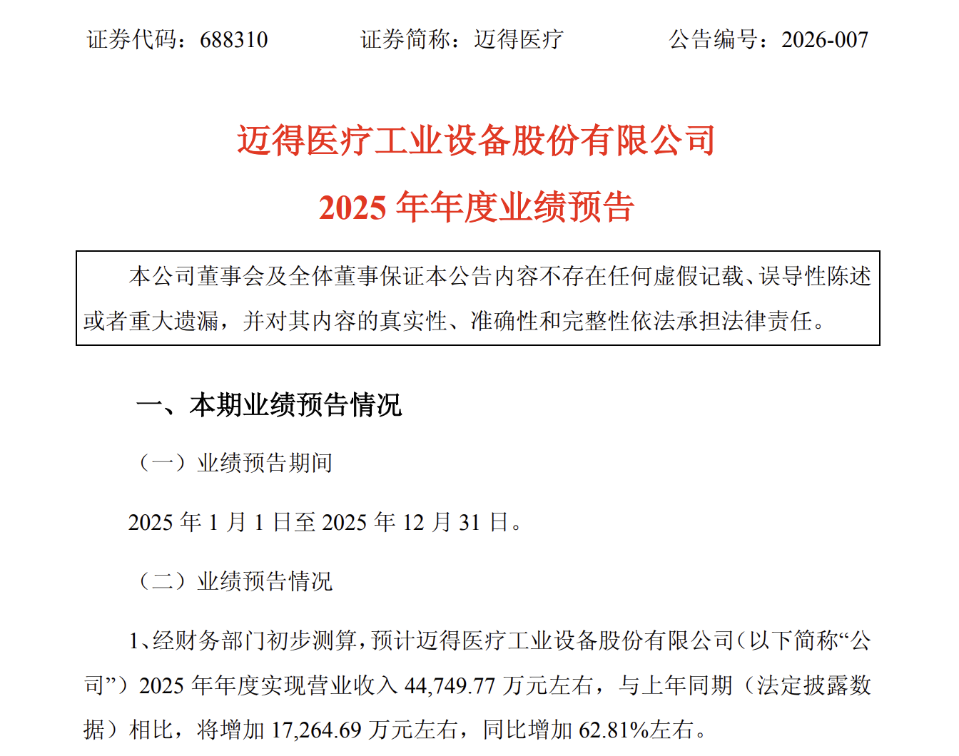 《科创板日报》1月26日讯(记者 史士云)今日,迈得医疗(688310.SH)发布2025年年度业绩预告称,经财务部门初步测算,预计公司2025年度实现营业收入4.47亿元左右,与上年同期相比,将增加1.73亿元,同比增幅约为62.81%。同时,预计净利润约为6652.13万元,与上年同期-1998.12万元相比,将实现扭亏为盈。