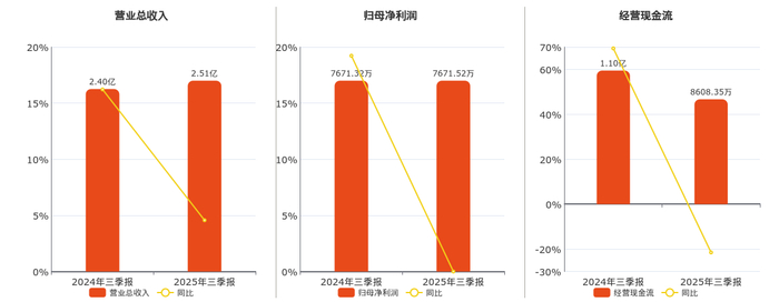 公司营业总收入为2.51亿元。归母净利润为7671.52万元。经营活动现金净流入为8608.35万元,较去年同报告期经营活动现金净流入减少2357.12万元,同比较去年同期下降21.50%。