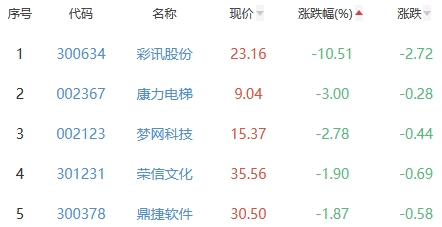 彩讯股份、康力电梯、梦网科技、荣信文化、鼎捷软件位列涨幅榜后五位,涨幅分别为-10.51%、-3.00%、-2.78%、-1.90%、-1.87%。